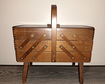 Singer Wood Accordion Style Sewing Box On Legs Folding Storage Etsy In 2023 Wooden Sewing Box Sewing Box Sewing Storage Box